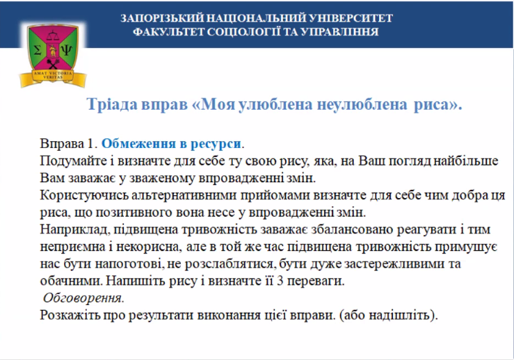 В якості спікера заходу виступила доцент кафедри філософії, публічного управління та соціальної роботи Запорізького національного університету, кандидат психологічних наук Бойко Ганна Валентинівна. Її підхід до реалізації програми поєднував глибоке розуміння теорії, практичну спрямованість та справжню людяність у роботі з групою.