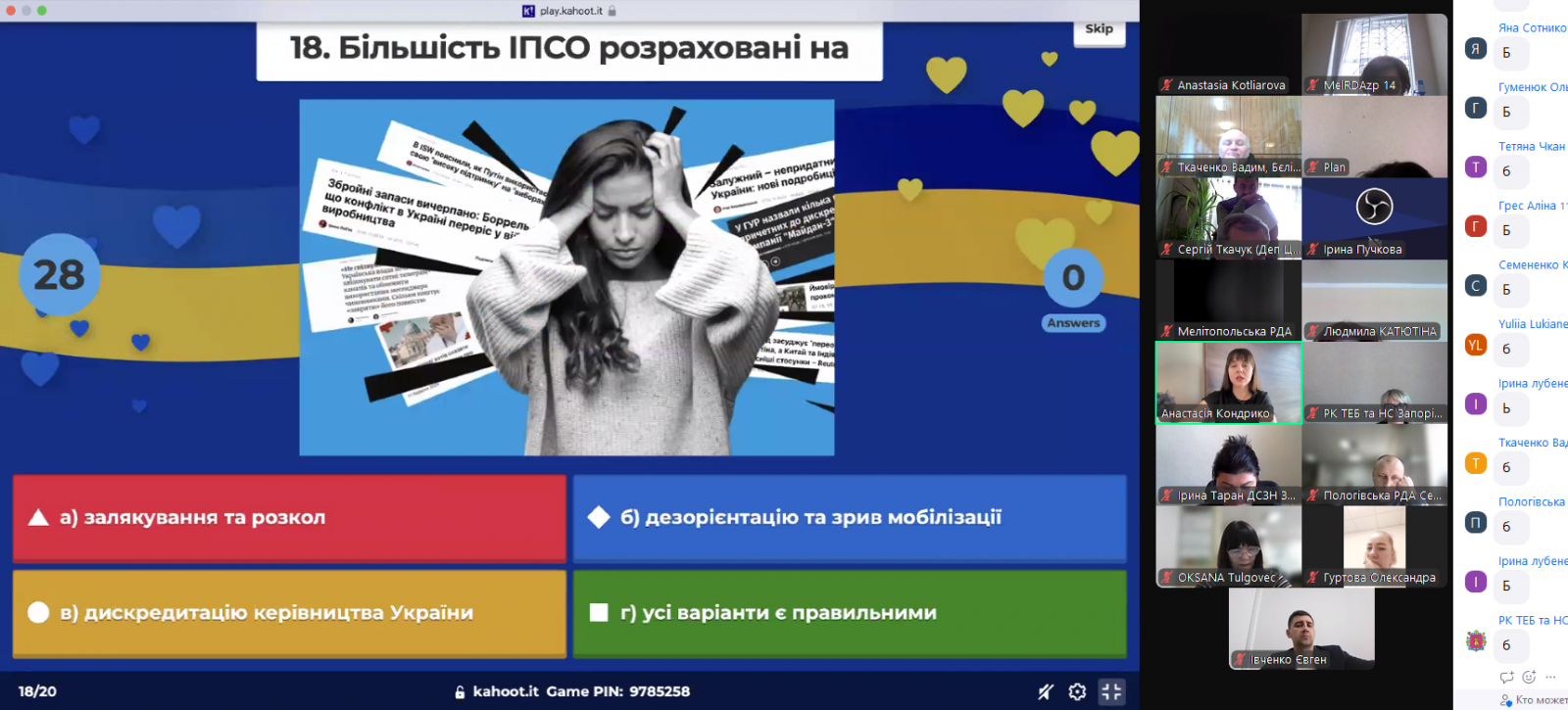Спікеркою навчального заходу була Анастасія Кондрико – директорка Центру медіа аналітики "Cyber Media Track", наукова консультантка Запорізького регіонального центру підвищення кваліфікації, членкиня Національної спілки журналістів України, кандидатка наук із соціальних комунікацій, яка фахово розкрила теми означеної програми. Наприкінці семінару учасники професійного навчання через інтерактивну гру на платформі "Kahoot!" мали змогу перевірити свої навички дотримання правил безпеки у кіберпросторі.
