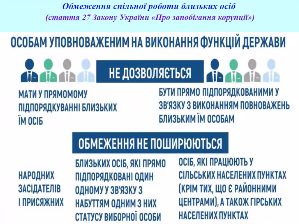 – "Загальні поняття конфлікту інтересів: потенційний та реальний конфлікт інтересів. Алгоритм дій у разі виникнення конфлікту інтересів та заходи врегулювання конфлікту інтересів. Інші заборони та обмеження на державній службі та службі в органах місцевого самоврядування";