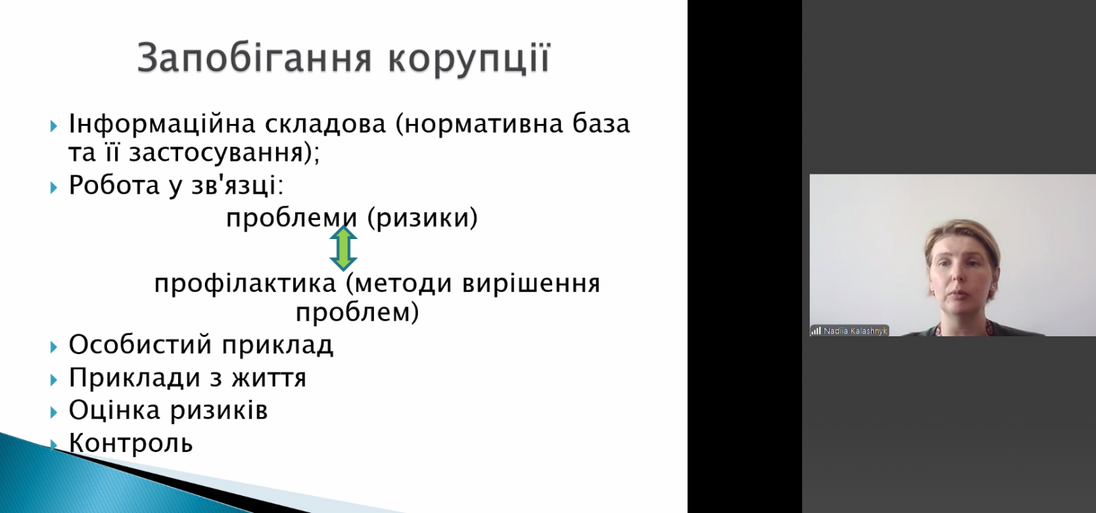 – "Корупційні ризики під час реалізації функцій держави або місцевого самоврядування. Управління корупційними ризиками та ролі учасників цього процесу";