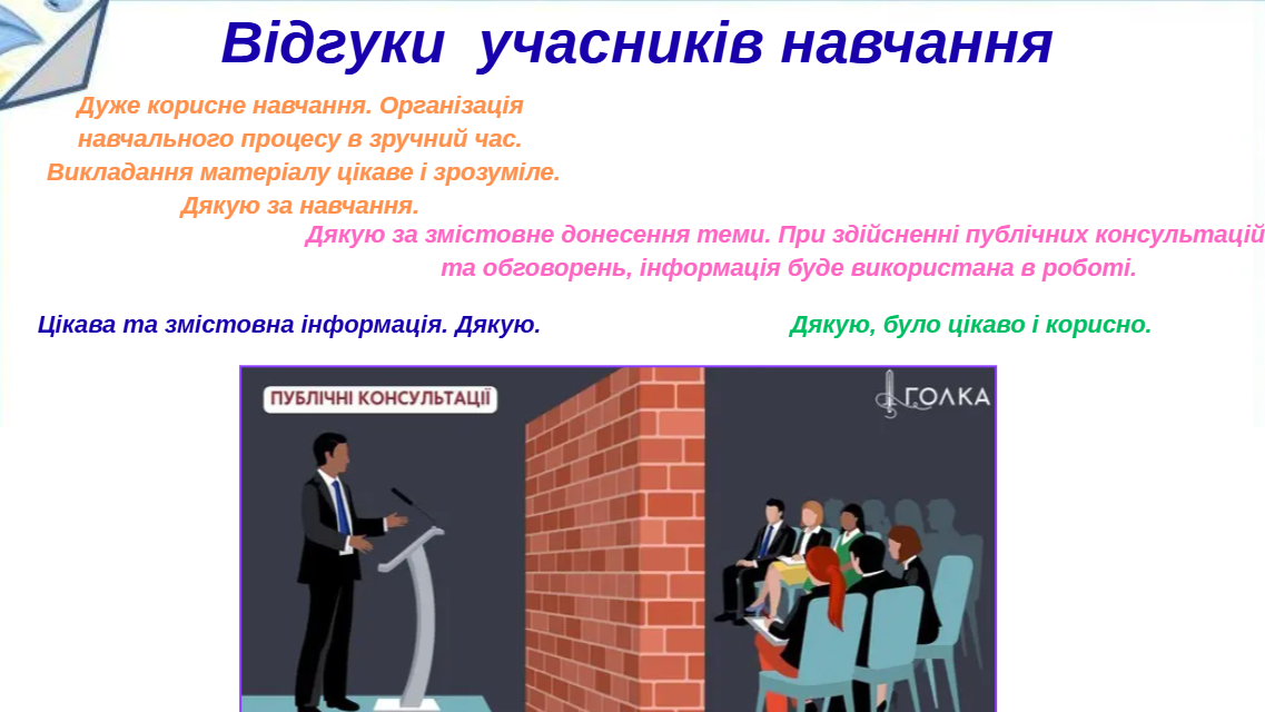Публічні консультації — це не лише інструмент прозорості, а й засіб підвищення довіри до влади, формування спільної відповідальності за прийняті рішення та побудови конструктивного діалогу між владою та громадою.