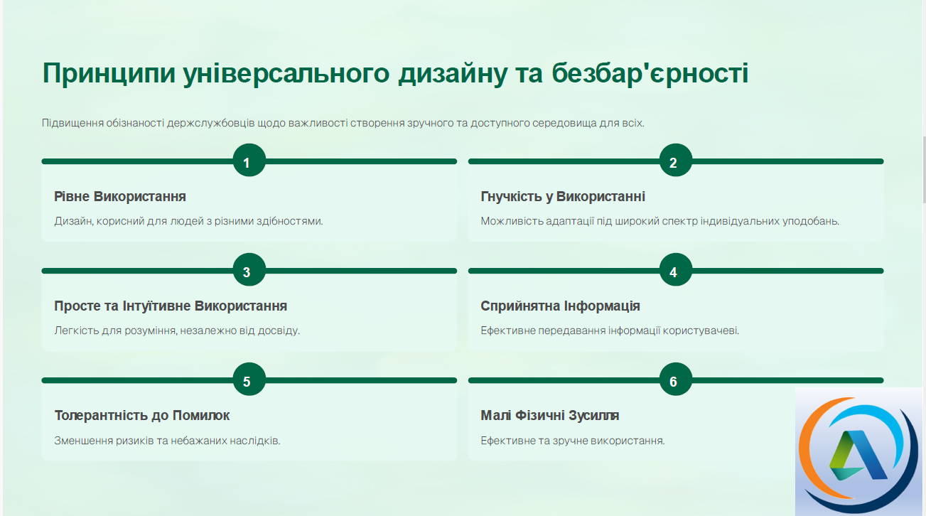 Під час опрацювання навчального матеріалу окрема увага була приділена підвищенню обізнаності публічних службовців щодо принципів універсального дизайну (universal design), а саме питанням створення середовища, продуктів, послуг або інформації таким чином, щоб вони були зручні та доступні для всіх людей незалежно від віку, статі, фізичних чи ментальних особливостей. Окремо було розглянуто питання написання грантових заявок з урахуванням принципів безбар'єрності та створення умов для фізичної доступності до публічних послуг. Окрім того, в ході навчання слухачі були ознайомлені з прикладами міжнародних практик інклюзивного розвитку територій.