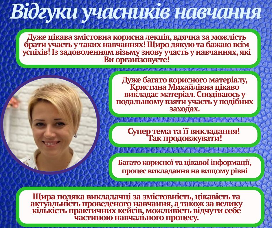 Особливо корисним було те, що теоретичні блоки одразу супроводжувалися практичними прикладами та розбором реальних ситуацій. Опанування навчальним матеріалом даної програми є чудовою інвестицією у власний професійний імідж та комунікативну компетентність.