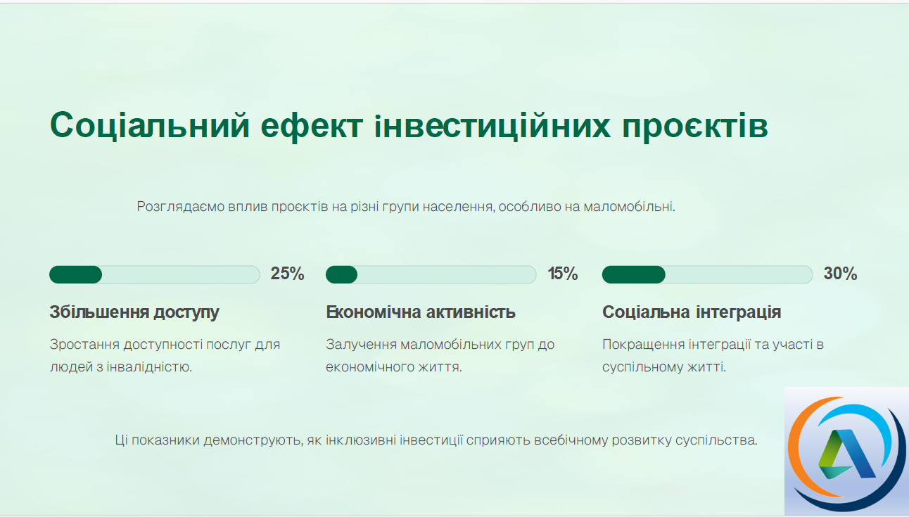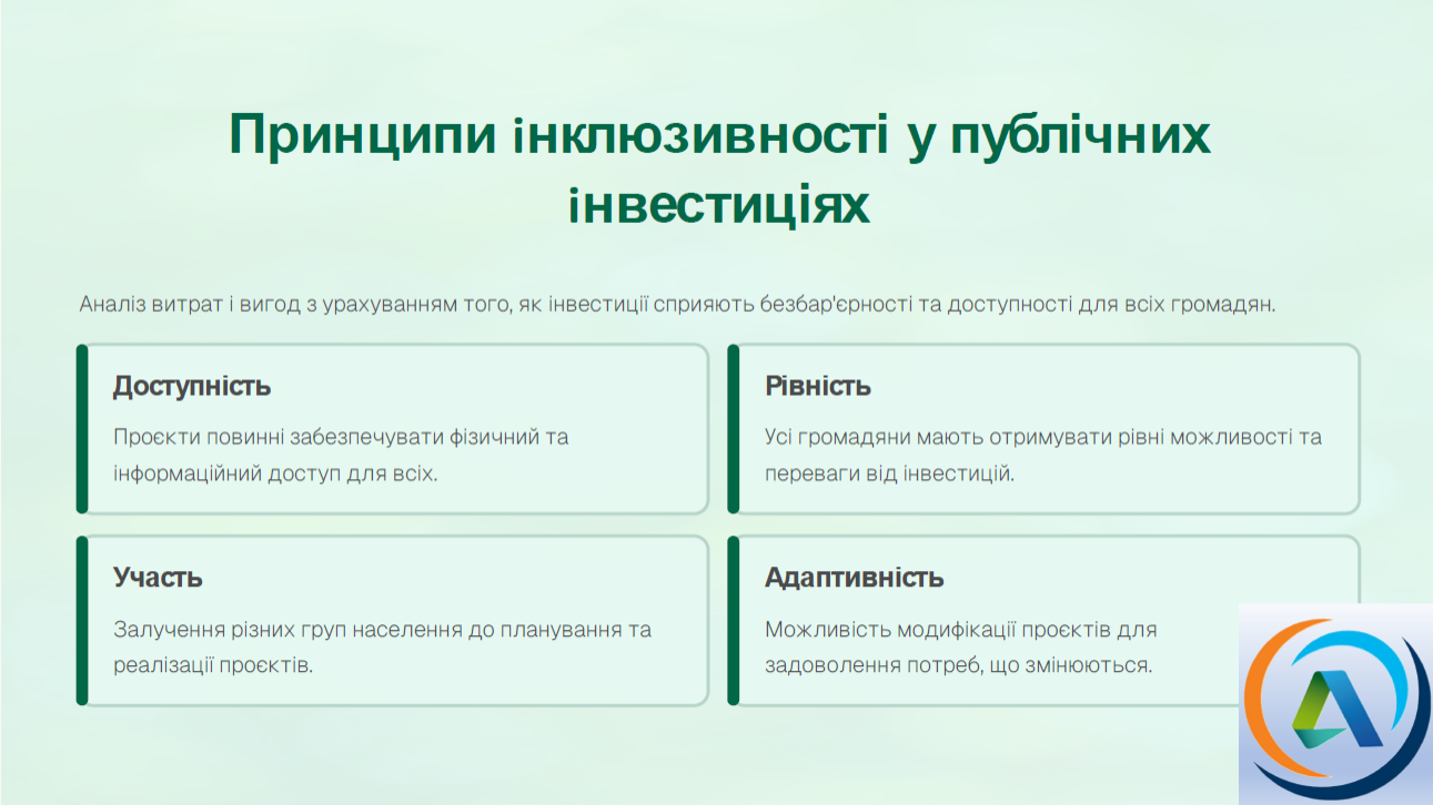Окремо спікер звернув увагу на тему безбар’єрності у контексті розробки та реалізації інвестиційних проєктів. Було наголошено, що сучасні підходи до аналізу витрат і вигодмають враховувати потреби всіх груп населення, зокрема людей з інвалідністю, маломобільних осіб та представників вразливих соціальних груп, також підкреслив, що врахування безбар’єрності не лише підвищує соціальну цінність проєкту, а й може позитивно впливати на його економічну ефективність та підтримку з боку донорів.