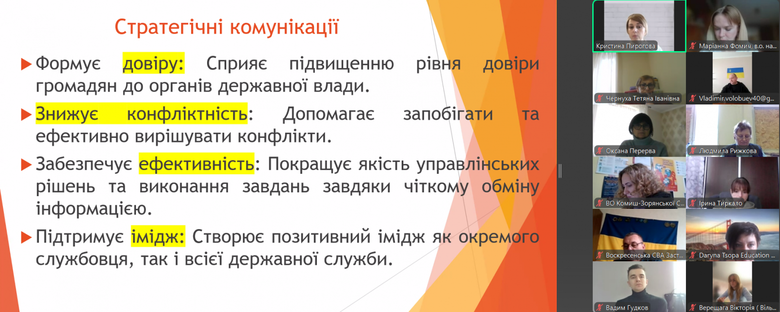 – "Стратегічні комунікації в діяльності органів публічної влади. Робота з цільовими аудиторіями. Комунікаційна стратегія в кризових ситуаціях";