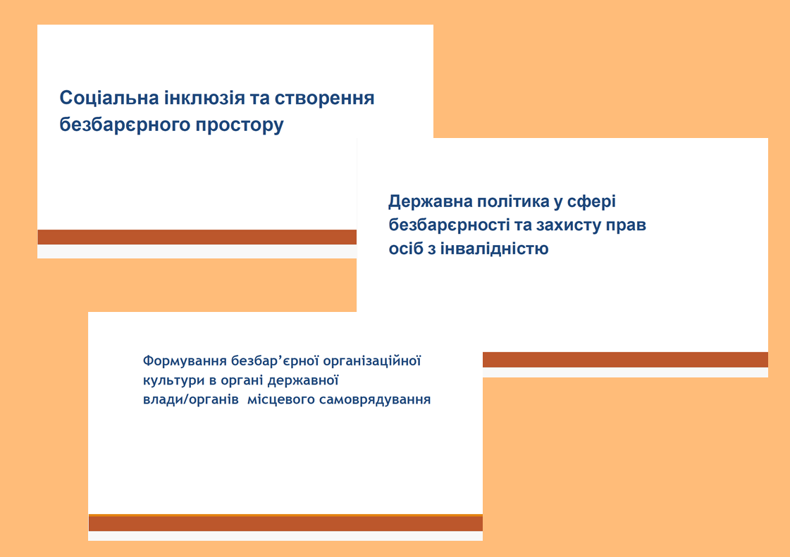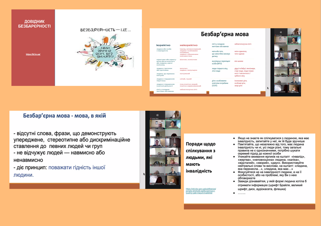 Спікером з означеної тематики була Наталія Рябушенко – радниця голови Волинської облдержадміністрації з питань забезпечення рівних прав та можливостей на громадських засадах, яка під час реалізації навчальних занять приділила особливу увагу поняттю безбар’єрності, яке охоплює не лише фізичну доступність будівель і послуг, але й усунення психологічних, інформаційних та комунікаційних бар’єрів, питанням реалізації державної політики з питань захисту прав та інтересів осіб з інвалідністю, зокрема щодо механізмів її реалізації на регіональному та місцевому рівнях; створення безбар'єрного простору як необхідної умови для інтеграції та адаптації осіб з інвалідністю у суспільство рівних можливостей. Також викладачка ознайомила публічних службовців із довідником безбар'єрності.