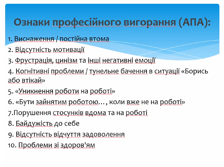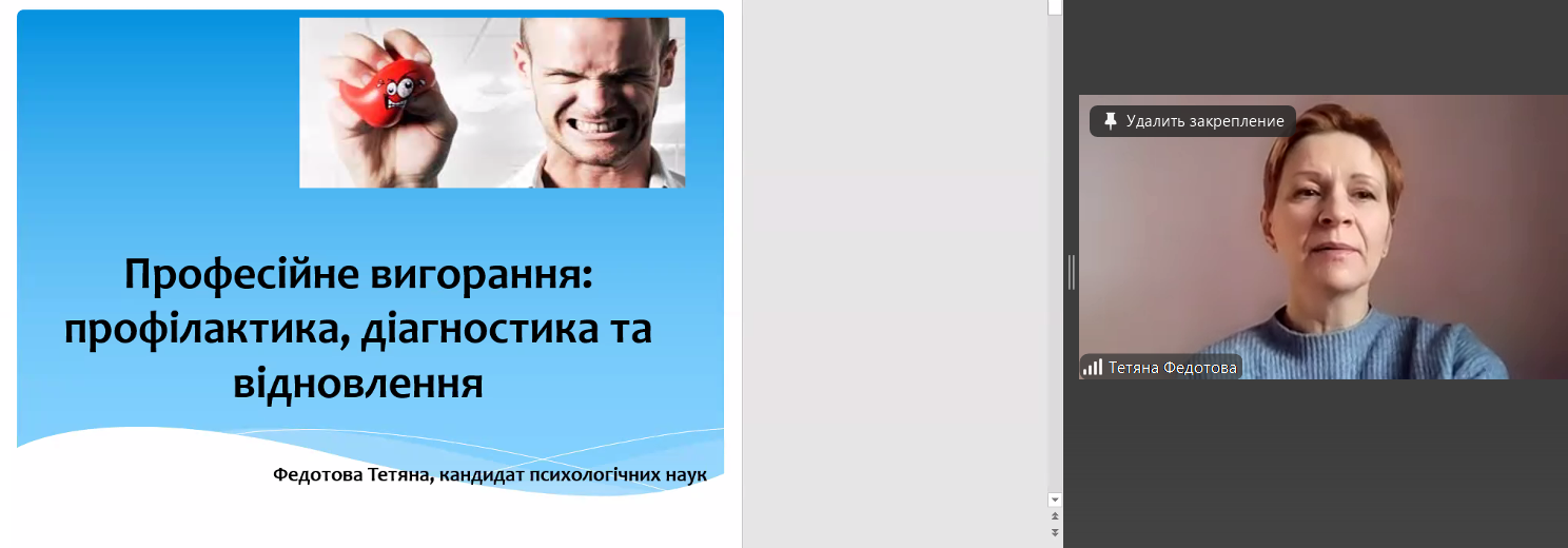 Також учасники навчального заходу отримали від спікера практичні поради щодо запобігання та профілактики синдрому професійного вигорання, ознайомилися з методами і способами подолання професійного вигорання особистості.