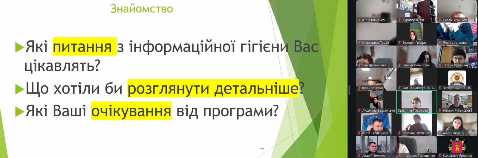Спікер навчання – Пирогова Кристина Михайлівна, завідувач кафедри української мови та журналістики Бердянського державного педагогічного університету, кандидат філологічних наук, доцент, продемонструвала високий рівень професіоналізму, глибокого розуміння тематики інформаційної гігієни та медіадидактики, а також вміння доступно й структуровано подати складний матеріал. Загалом реалізація даної програми повністю виправдала очікування учасників професійного навчання, сприяла підвищенню рівня медіаграмотності та формуванню практичних навичок безпечної й усвідомленої роботи з інформацією. Учасники навчання ознайомилися з практичними алгоритмами перевірки джерел, фактчекінгу та розпізнавання маніпулятивних повідомлень у медіапросторі.