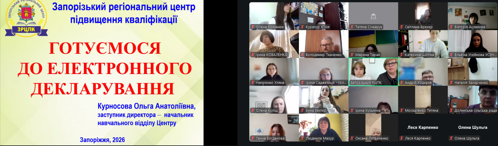 Спікерами даної програми виступили: Кононенко Інна Миколаївна – заступник директора Запорізького регіонального центру підвищення кваліфікації, Курносова Ольга Анатоліївна – заступник директора – начальник навчального відділу Запорізького регіонального центру підвищення кваліфікації, Славова Наталія Захаріївна – головний спеціаліст Дніпровського відділу державної реєстрації актів цивільного стану у місті Запоріжжі Дніпровського міжрегіонального управління Міністерства юстиції України.