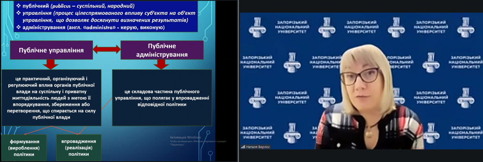Верлос Наталя Володимирівна, професор кафедри конституційного та адміністративного права юридичного факультету Запорізького національного університету, доктор юридичних наук, професор, висвітлила основні аспекти організації державної влади в умовах реформування системи управління, сучасні підходи до розвитку місцевого самоврядування, а також розкрила можливості впровадження інструментів електронного урядування та електронної демократії в умовах цифрової трансформації суспільства.