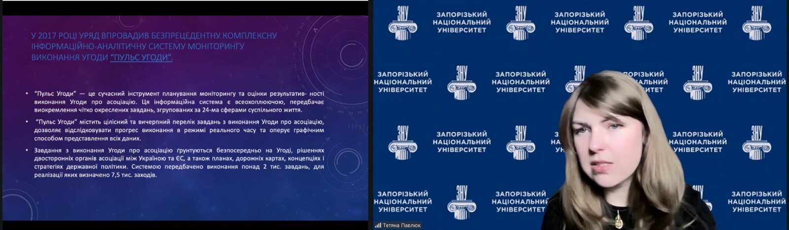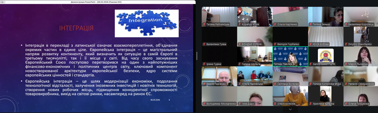 Павлюк Тетяна Сергіївна, завідувач кафедри підприємництва, менеджменту організацій та логістики факультету менеджменту Запорізького національного університету, кандидат економічних наук, в ході навчання ознайомила слухачів з основними напрямами європейської інтеграції України, особливостями реалізації положень Угоди про асоціацію, а також можливостями використання інструментів співпраці з Європейським Союзом для розвитку територіальних громад та регіонів.