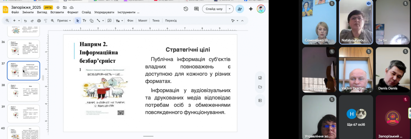 Рябушенко Наталія Пилипівна – позаштатний викладач Запорізького регіонального центру підвищення кваліфікації, радниця голови Волинської облдержадміністрації з питань забезпечення рівних прав та можливостей на громадських засадах, детально опрацювала з учасниками професійного навчання та змістовно розкрила теми: «Національна стратегія зі створення безбар’єрного простору в Україні», «Основи соціальної захищеності осіб з інвалідністю», «Гендер та гендерна рівність. «Ґендерно-орієнтоване бюджетування». Вона акцентувала увагу на тому, що гендерна рівність і ґендерно-орієнтоване бюджетування є взаємопов’язаними складовими сучасної державної політики, спрямованої на забезпечення рівних можливостей та підвищення якості управлінських рішень. Вона подала матеріали ґрунтовно та доступно, із висвітленням ключових аспектів і практичного значення кожної теми.