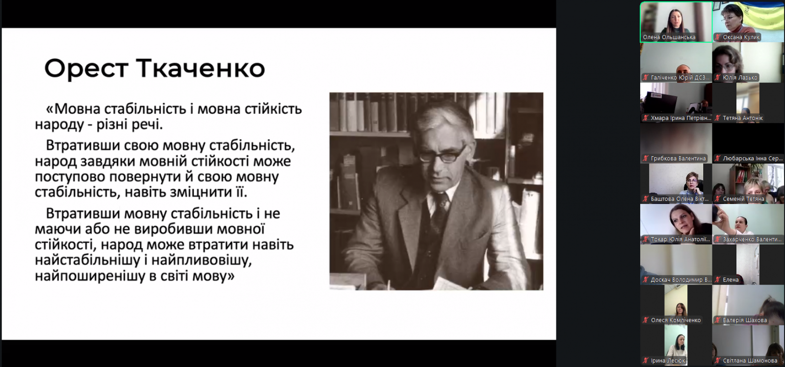 Впродовж двох навчальних днів з учасниками професійного навчання працювала Олена Ольшанська, яка ознайомила слухачів із мовленнєвим етикетом як складовою частиною реалізації мовної стійкості, джерелами та формами реалізації мовної стійкості, проаналізувала типові помилки у сучасному українському діловому мовленні та надала поради слухачам щодо подолання суржику у спілкуванні. Під час навчальних заходів публічні службовці виконували тренувальні вправи, відповідали на питання викладачки у чаті.