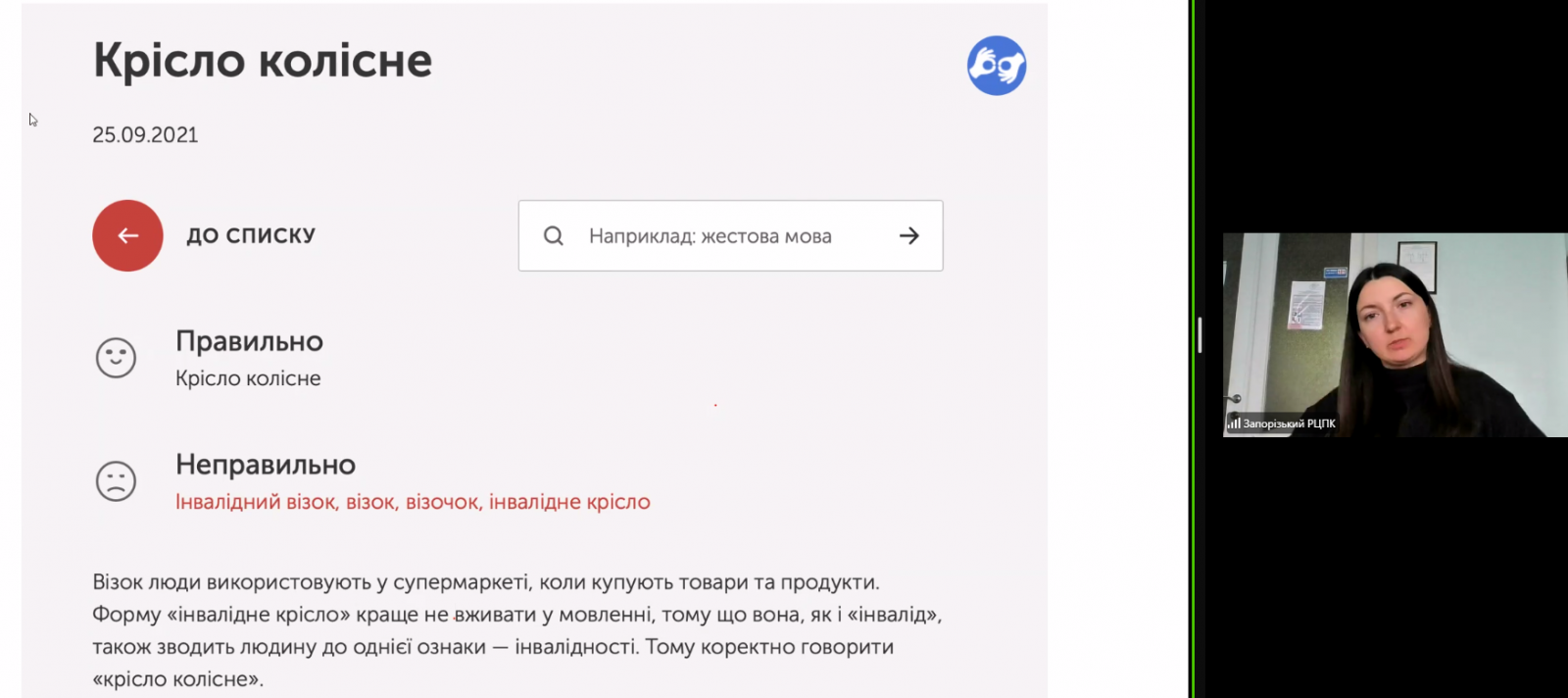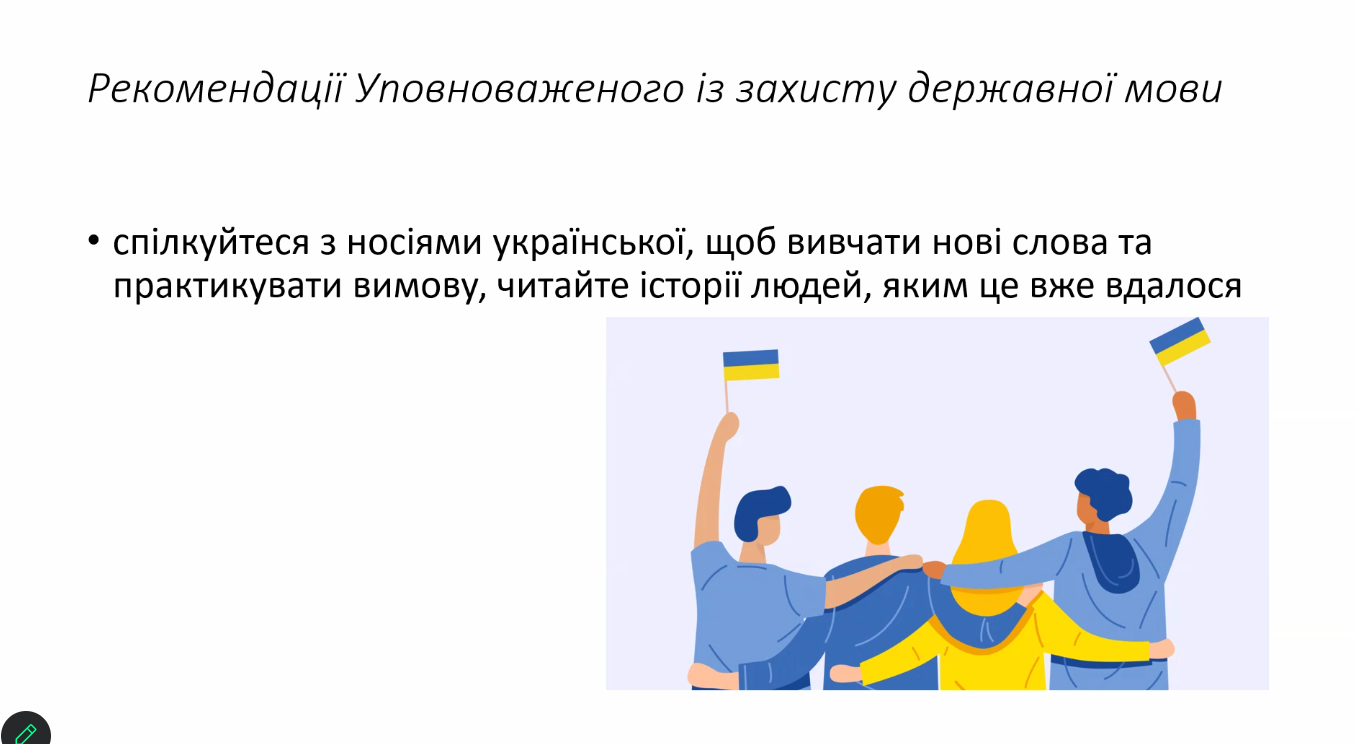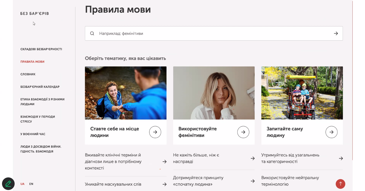 Під час реалізації означеної програми спікерка приділила особливу увагу принципам безбар’єрної мови, акцентувала увагу на тому, що безбар'єрна мова – це мова, в якій відсутні слова, фрази, що демонструють упереджене, стереотипне або дискримінаційне ставлення до певних людей чи груп, це мова, яка не відчужує людей – навмисно або ненавмисно. Також викладачка ознайомила публічних службовців із офіційним сайтом Уповноваженого із захисту державної мови (мовний омбудсмен) та електронним ресурсом, на якому розміщений "Довідник безбар'єрності".