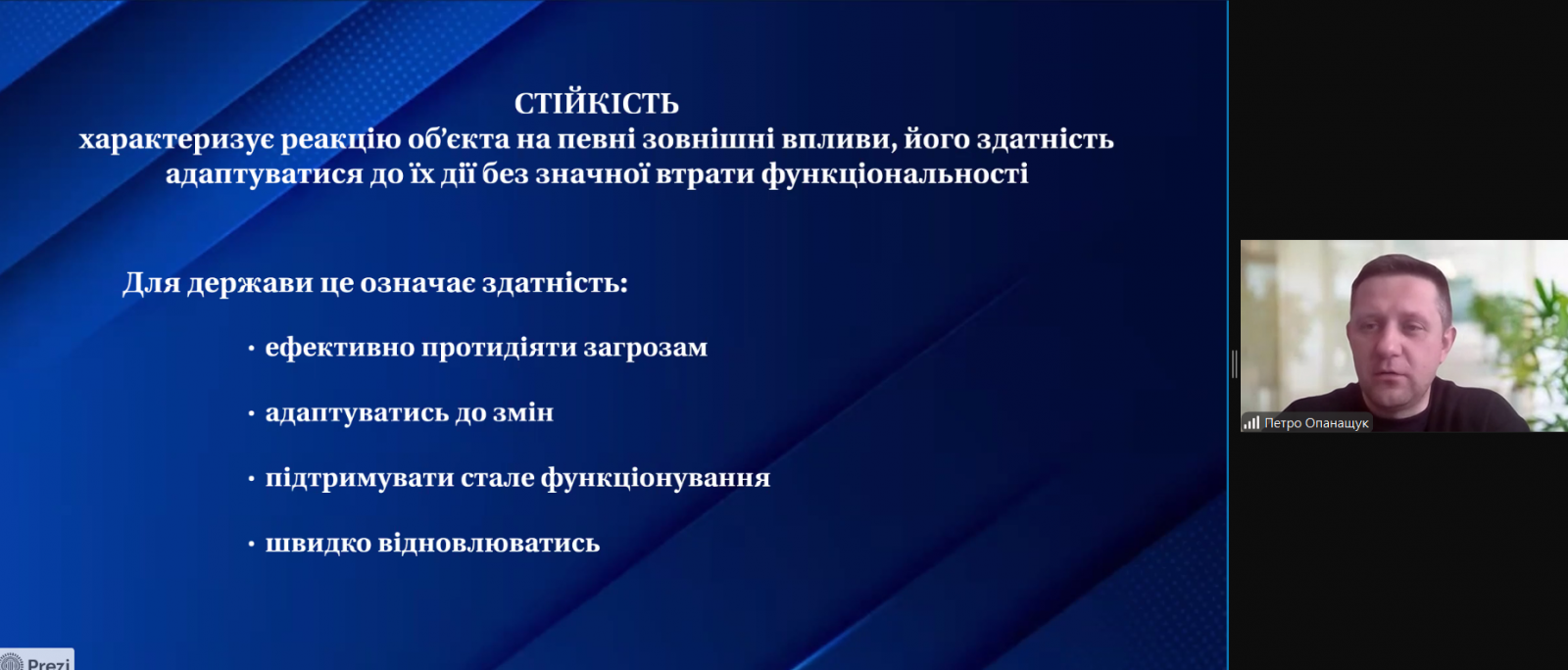 Національна стійкість – це здатність держави та суспільства протистояти загрозам, адаптуватися до криз (як-от війна чи пандемія) і швидко відновлюватися, зберігаючи суверенітет і функціональність. Вона критично важлива для виживання держави, забезпечуючи єдність влади, армії та громадянського суспільства, безперебійну роботу інфраструктури та економічну стабільність.