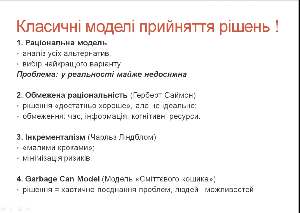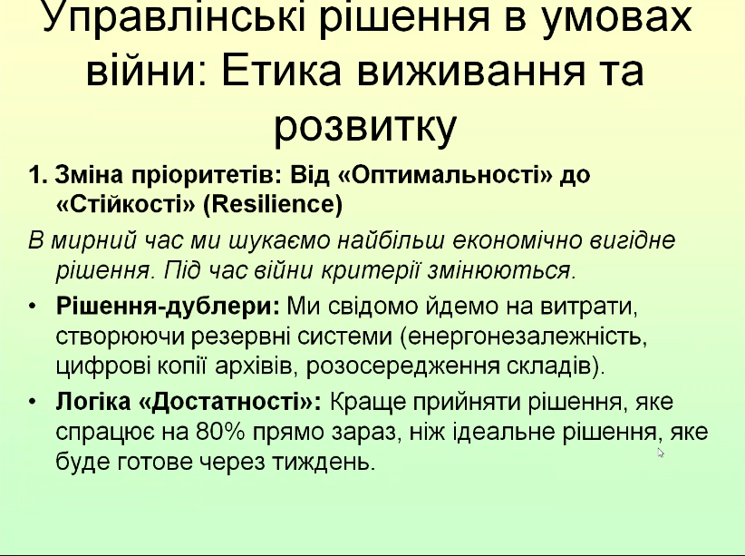 У межах навчальної програми було розглянуто широкий та змістовний спектр тем, що охоплюють ключові аспекти процесу прийняття ефективних управлінських рішень. Особлива увага приділялася розкриттю сутності та етапів прийняття рішень, що дозволило сформувати цілісне розуміння даного процесу – від виявлення проблеми до обрання оптимального варіанту її вирішення. Окремим важливим блоком стало вивчення підходів до оцінки альтернатив та вибору найефективнішого варіанту дій, а також прийняття рішень в умовах невизначеності та ризику. У процесі навчання окрему увагу було приділено питанню відповідального підходу до використання сучасних технологій, зокрема штучного інтелекту, під час прийняття управлінських рішень. Було наголошено, що, попри значні можливості таких інструментів, їх застосування не повинно замінювати професійне судження, досвід і відповідальність людини, а також було зазначено, що відповідальність за прийняті рішення завжди несе людина, а не цифровий інструмент. Саме тому важливо зберігати баланс між використанням сучасних технологій і власною професійною компетентністю.