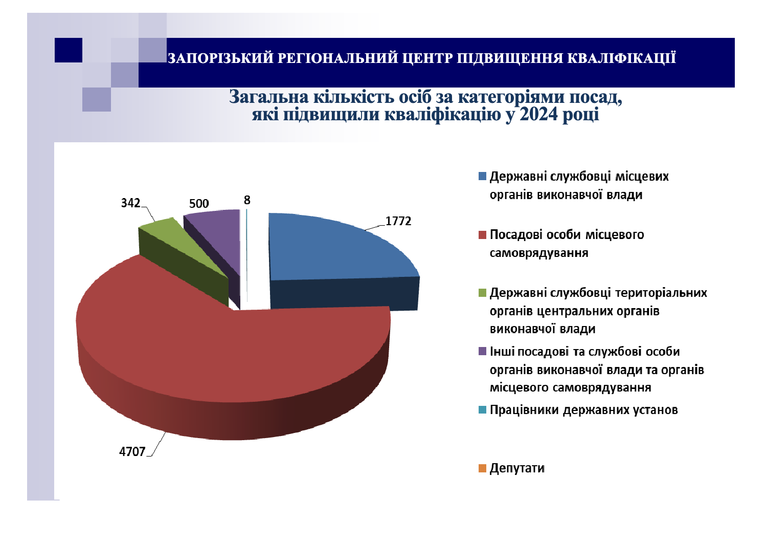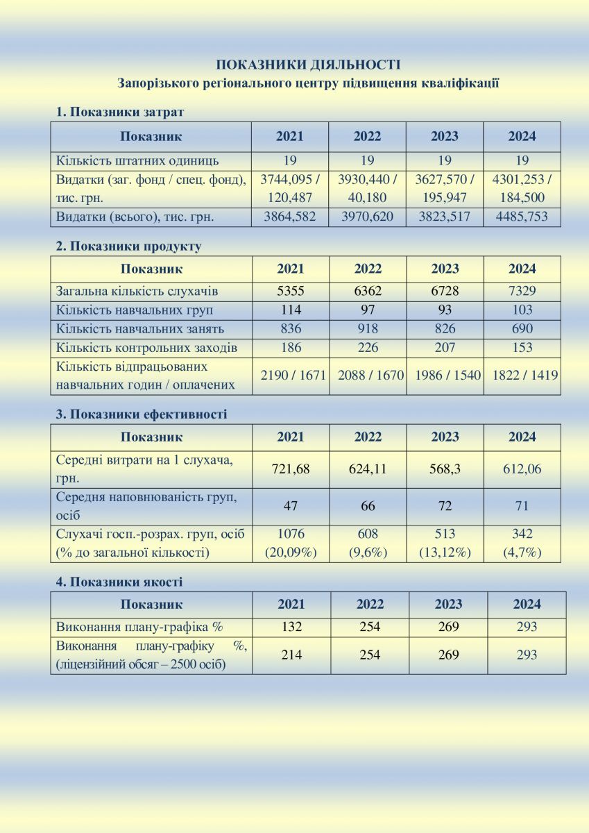 Впродовж 2024 року діяльність Запорізького регіонального центру підвищення кваліфікації (далі – Центр), як закладу післядипломної освіти, була спрямована на виконання плану-графіка підвищення кваліфікації державних службовців місцевих органів виконавчої влади, посадових осіб місцевого самоврядування, посадових осіб військових адміністрацій населених...