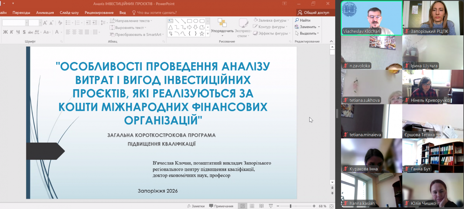 13 та 14 квітня 2026 року Запорізьким РЦПК проведено навчання за загальною короткостроковою програмою підвищення кваліфікації "Особливості проведення аналізу витрат і вигод інвестиційних проєктів, які реалізуються за кошти міжнародних фінансових організацій", яке охопило 60 публічних службовців Запорізького регіону.